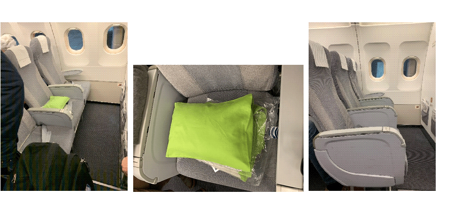 This is Europe, so Business class seats are identical to Economy seats, but since this aircraft has a 3-3 configuration, the middle seat is blocked out (unlike on Finnair’s E190s). In the seat was again a small green Marimekko pillow and blanket in case one of us got cold during our short flight. I like Finnair’s Nordic-style (read: white and gray) cabin design by itself, but the splash of color from the green pillows really brings it out.