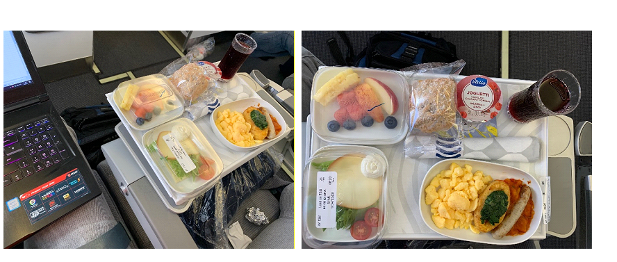 About 20 minutes after take-off, the meal service began. I am always listed as having the seafood meal (as a way to guarantee I won’t be served beef). Despite this being breakfast, I still got a special meal, but didn’t actually get served any seafood. Krister had the regular meal (but didn’t take any pictures). He got served an omelet instead of scrambled eggs, and I think the sausage here was vegetarian, but it might have been pork; I didn’t ask since it wasn’t a problem for me. Like on the previous flight, the food was served with all the covers still on. The service was polite and efficient but minimal, due to the pandemic. Unless something really were to be off, I couldn’t fault the flight attendants for anything.