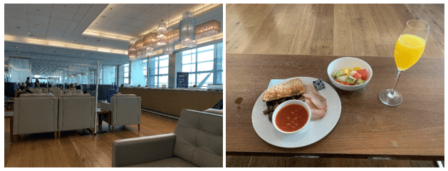 Upon arrival in the lounge, I sat down and ordered a build-your-own English breakfast, a fruit bowl, and a mimosa. The lounge wasn’t too busy, but the food took a bit longer than previous times to arrive.