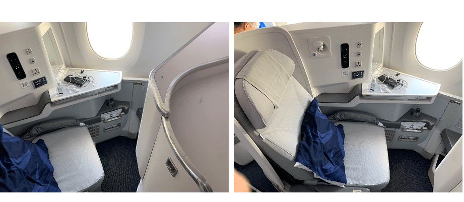 There are no overhead bins above the center seats, which creates a very nice and airy cabin. At my seat, bedding and some small earphones were waiting.