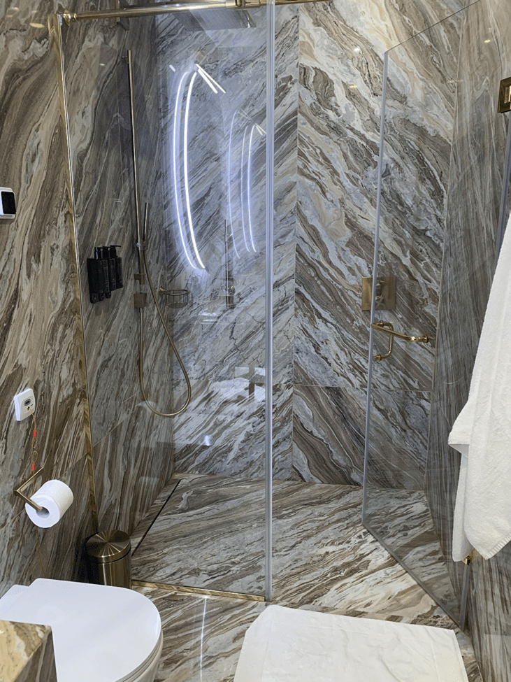 The most unique part of the room was the bathroom. The most characteristic part is the marble, which completely covers the bathroom.