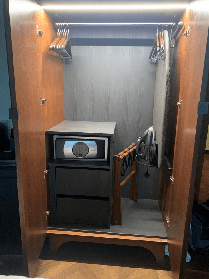 In the wardrobe were the additional amenities expected, including a small safe, drawers, and ironing board/iron.