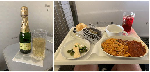 Shortly after takeoff, drinks were served. I had champagne and blueberry juice, as per usual. Then they came through with the meal service. Since the upgrade was a surprise, I wasn’t able to prebook a meal, so I was very happy to see that it wasn’t a beef meal.