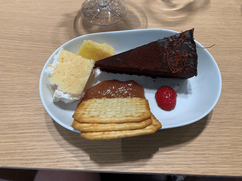 For dessert, I went for both a sweet and a savory item: chocolate cake and a cheese course. I’m not usually big on chocolate, but I took one for the team on this one. The cheese options were excellent, and the cake was rich but not overly so.