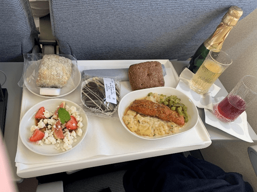 Shortly after takeoff, the inflight service began with a drinks service. The flight attendant then came around a second time with drinks right before serving the meal. I had ordered a seafood meal, and I noticed that everyone was served a salmon meal. The only difference I could tell was that everything on my tray came prepackaged and had a specific type of bread and had a different (vegetarian) starter.