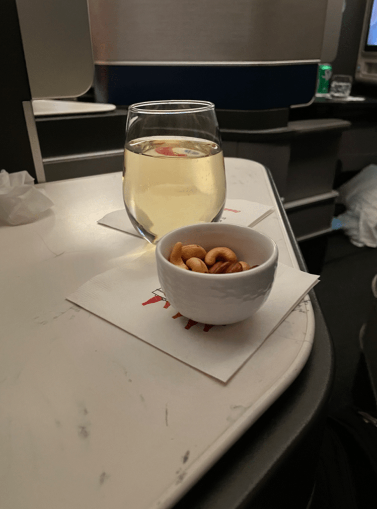 The meal service began with some bubbly and nuts as is usual in Business class. No menus were provided, which was a bummer, especially given that American provides menus on its non-premium transcontinental routes. And I even got a menu on a (long) BA intra-Europe flight.