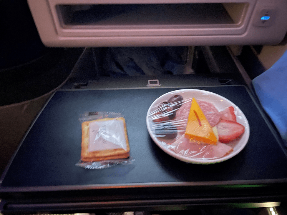 About an hour before landing, the flight attendant came around to provide a pre-arrival cheese plate to those of us who were awake. The cold cuts were pretty average and the fruit was a bit sparse, but given how short the flight was, a small pre-arrival snack made sense.