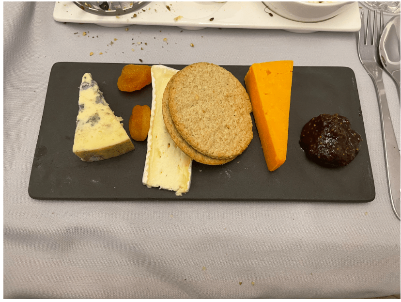This dish tasted like something you’d get at a British pub, which I think is extremely appropriate for a Club World flight. It had as much gravy, skin, and roasted vegetables as you’d expect from a pub. I’d’ve been perfectly fine having this at a pub on the ground (not that I every really did when I lived in England). Finally came the cheese board: