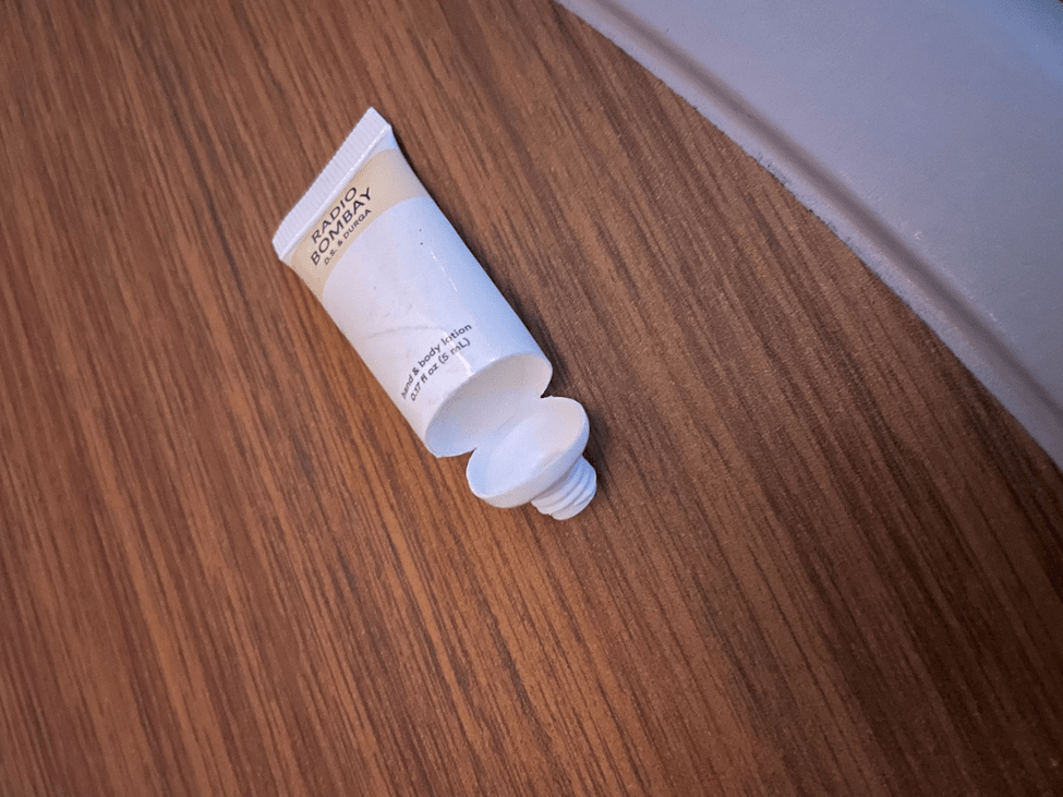 So Radio Bombay is not exactly a brand I’m impressed by at this point… No matter. Since 5F was empty, I just went and took the kit from that seat and then got some lotion.