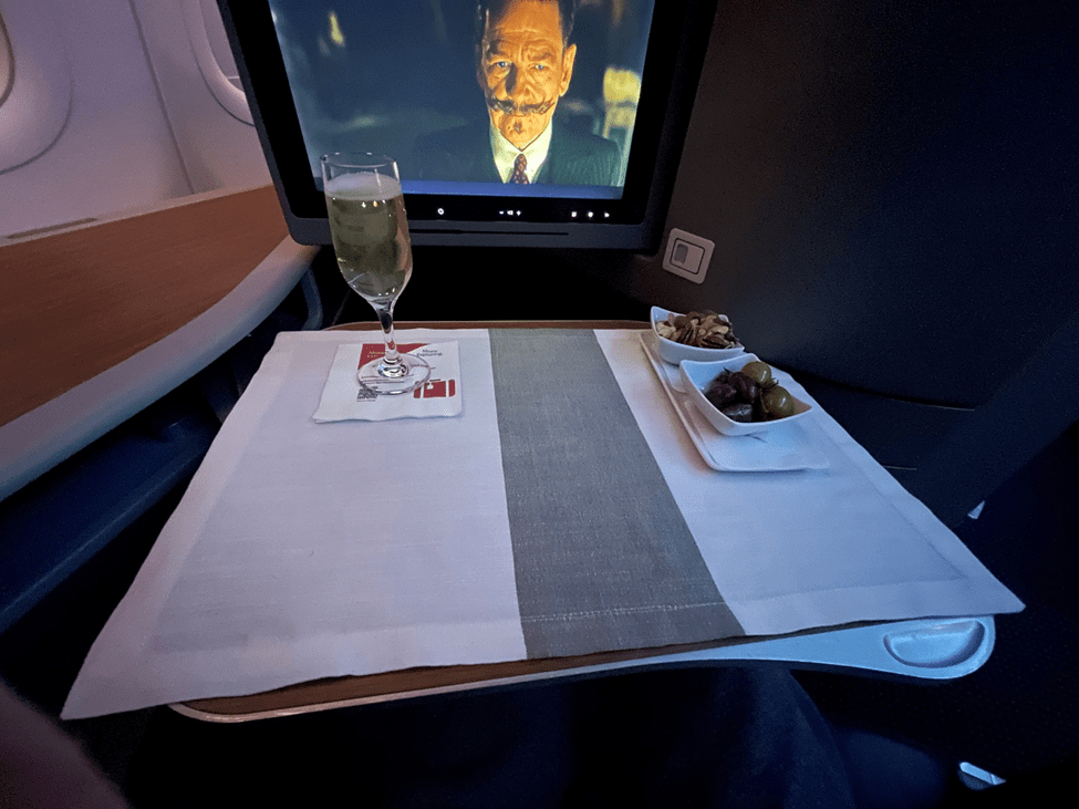 According to the timestamps on the pictures, the inflight service began just under 30 minutes after takeoff. As is standard, the meal service in Flagship First began with a welcome drink (champagne for me), mixed nuts, and olives.