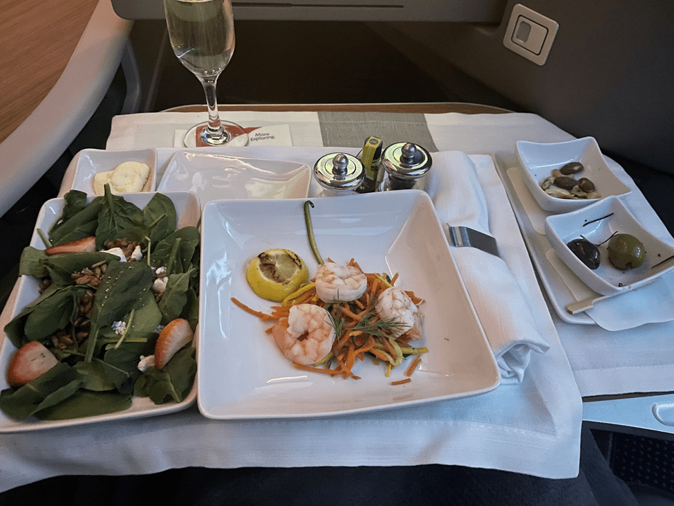 Since I had had so many problems just getting to the airport, I hadn’t had time to eat in the lounge, so I was actually hungry for the meal for once, haha. About 5 minutes after the table was set, the tray with the salad and appetizer was delivered. The spinach salad was simple and was what you’d expect given the description on the menu. I’m not a fan of spinach salads, but many people are. I ordered the poached shrimp as my appetizer. I guess poached means it was cooked at a lower temperature than boiling, but ok. It just tasted like shrimp cocktail on some cooked, cold vegetables, which is basically all it was. I enjoyed it.