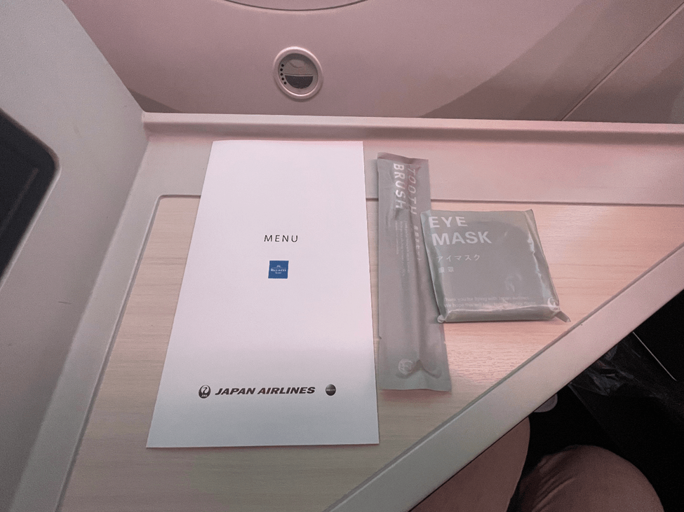There was no amenity kit, but shortly after taking my seat, the extremely friendly and attentive flight attendants came around to introduce themselves. One of them came with a basket to offer the individual contents of amenity kit. I selected a toothbrush and an eye mask, which are the two amenities from these kits that I most frequently use.