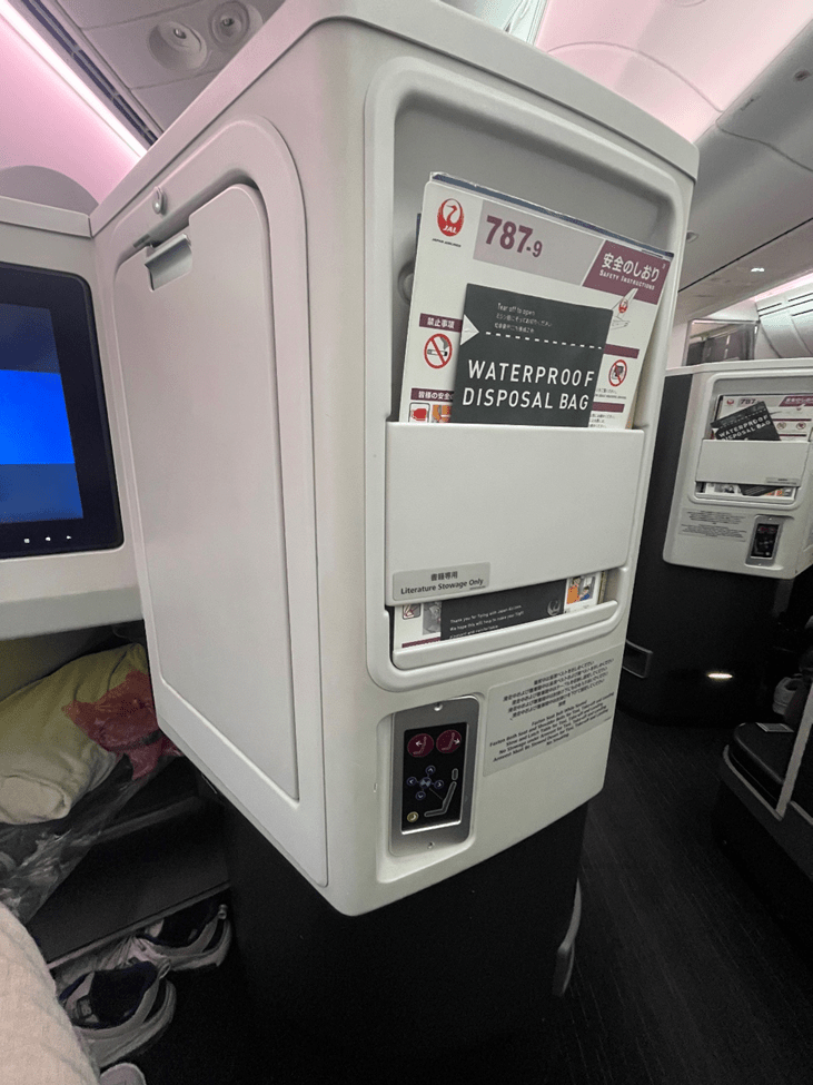 I have one complaint about the seat’s design though. The tray table and literature stowage area are basically directly in front of you and are hideous.