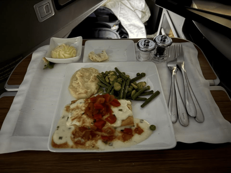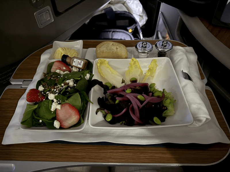 As is standard for me, I had eaten in the Chase lounge, so I delayed the meal until late in the flight. That meant that I didn’t get a choice of appetizer, so I got the beet poke. It was fine minus all the onions. I don’t really know what makes beets become poke, but here we are. The salad was exactly as it looks: nothing wrong but nothing exciting.