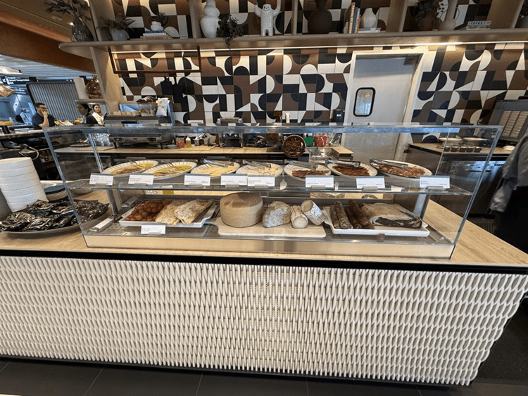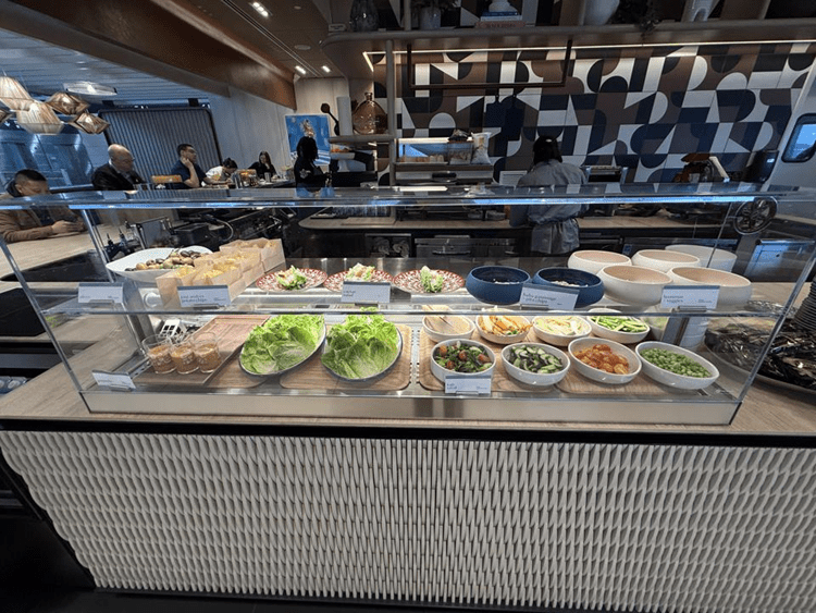 The Landing consists of a served buffet and an à-la-carte dining menu available through a QR code. The food offers vary by time of day and rotate over time. But there are consistently two cases containing the served buffet food:
