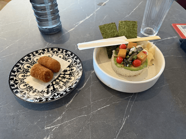 I ordered a serving of croquettes and the eggplant and tofu donburi. The donburi was beautifully presented and tasted great. The flavors complimented each other well. The croquette was also very good but much more standard for what you’d expect from a croquette.