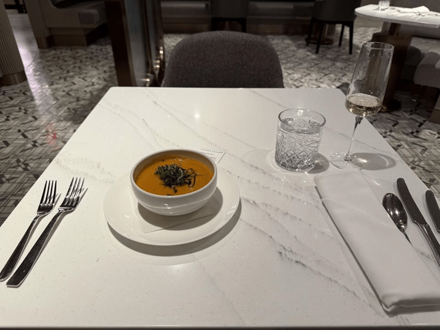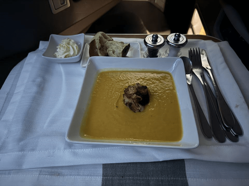 The dim cabin really did make it almost feel like I was dining by candlelight. Next up came the sweet potato and cauliflower soup, which I ate with a pretzel roll. As much as the soup course is a super cheap way to differentiate Flagship First and Flagship Business service, I really do enjoy it.