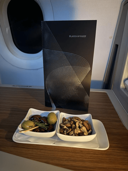 The delay was unfortunate, but at least it increased the time between meals for me. And on the plus side, all the extra time meant that my seat had headphones and an amenity kit, unlike on my previous Flagship First flight. Since I have now completed my 10 seat challenge, I selected 5F, which is my second favorite after 5A (which was already taken when I booked).