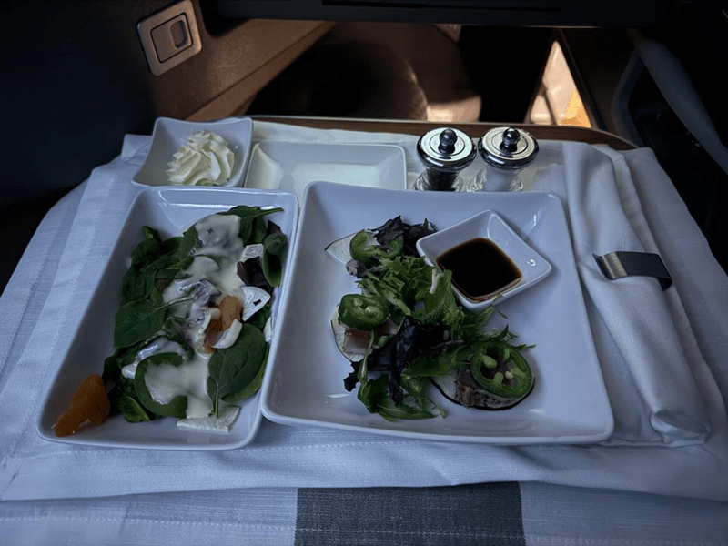 Having tried had beets on my previous Flagship First flight, I went back to my more typical order of the seared tuna appetizer. It was served with the seasonal greens salad, which was served with the dressing already on it. That’s the first time I’ve had a salad served that way on a plane. Luckily I did like the dressing, and the seared tuna was similarly excellent. I’ve since learned that higher quality tuna is also firmer. This tuna was not firm, so I assume that means it was lower quality, but it still tasted great with the ponzu sauce.