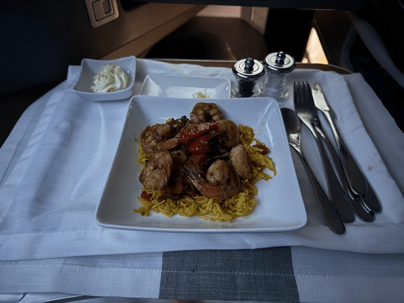 Whenever I can, I pre-order on these flights because US carriers tend not to cater any more food than necessary. You can only pre-select the main, so I selected the Ranchero Seared Shrimp, which sounded like a (lazy) form of paella on the menu to me.
