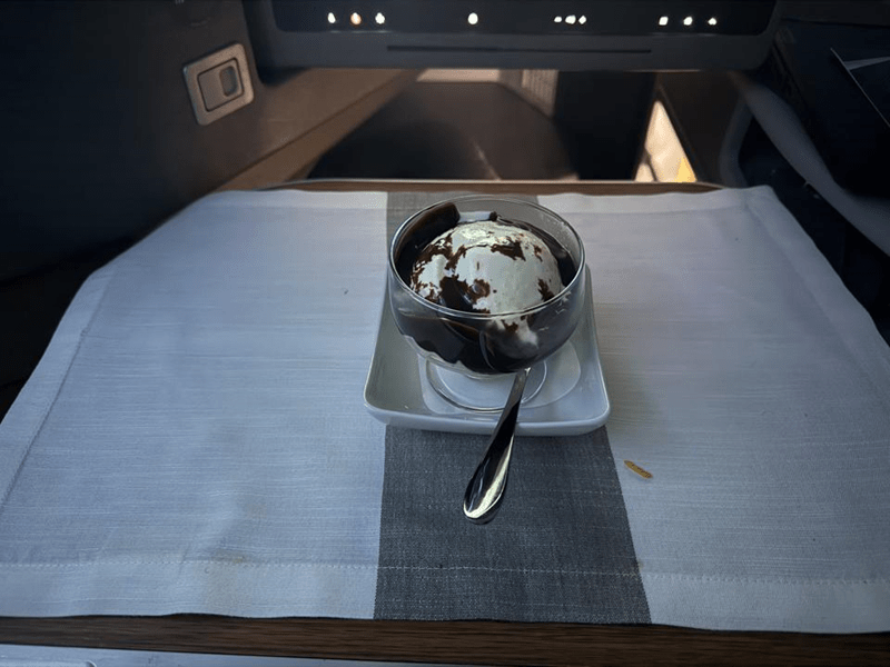 And then finally came the ice cream sundae, which I ordered with just hot fudge. Truly can never go wrong with it. I don’t claim to want the finest of dining in the sky, but I do recognize that these ice cream sundaes are very basic and sugar-filled. And I love them.