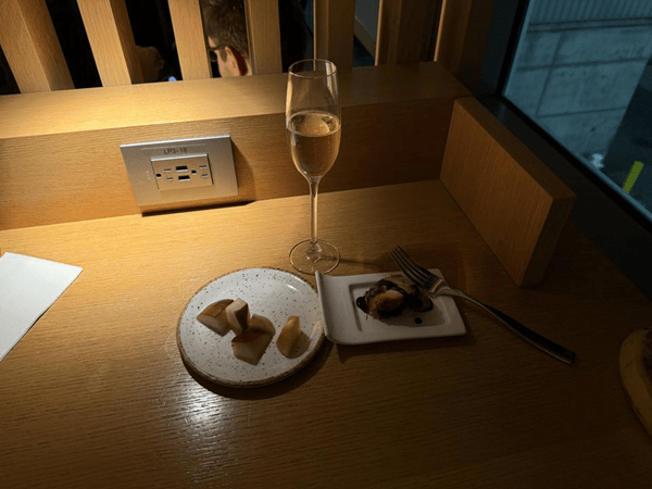 Oh well. So, I just grabbed a bit of dessert from the cold bar and a glass of bubbly. I’ll be eating on the plane anyway.