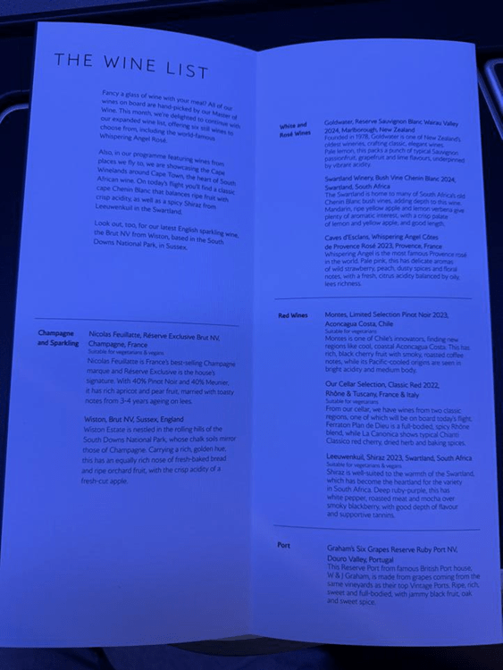 British Airways catering these days (at least out of San Francisco) is decently consistent, with three choices each of starter, main, and dessert/cheese for dinner and a set of three choices for breakfast. Nothing about the food choices were unique to this flight; it could’ve easily been a BA flight to anywhere (at least anywhere in the US)