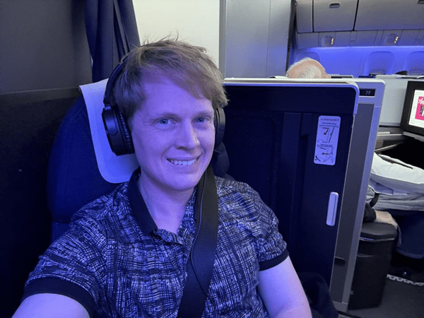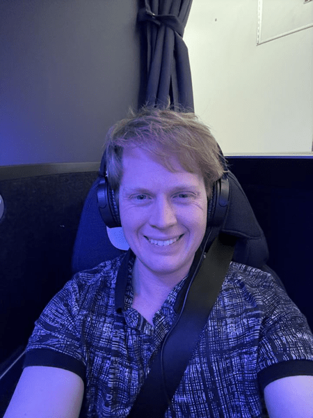 Since this is an intercontinental long-haul flight, I opted to take two selfies with my seat: