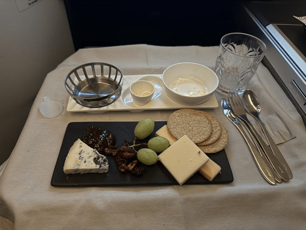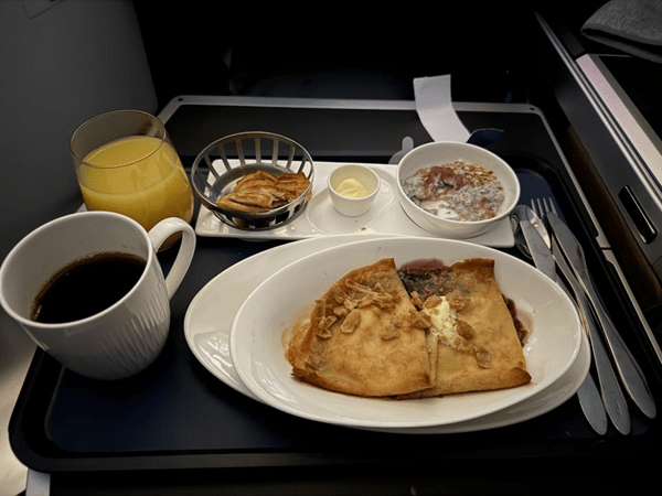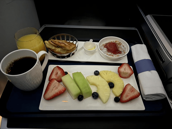 Speaking of having a flight land at 4 pm, at around 1/2 pm UK time, breakfast was served. It started with orange juice, chia pudding, fruit, and a pasty. I also ordered a coffee.