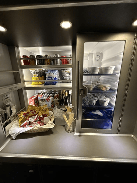 After the meal service ended, I got ready for bed. On my way to the lavatory, I noticed that they had set up a snack selection, which included drinks, chips (crisps), yogurt, and fruit. Now I know where the flight attendant got me the fruit to go with my pancakes a couple years ago.