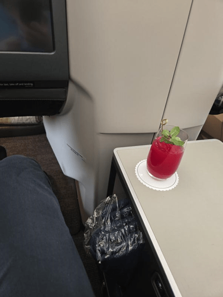He was offered a pre-departure beverage upon boarding, which was a refreshing beverage made of a medley of flowery/fruity flavors. He was a big fan of the mocktail but noted that there were no alcoholic drinks on immediate offer.