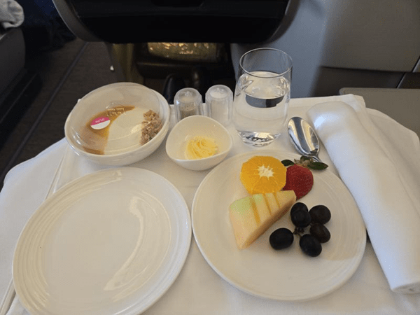 Service on this flight was dine-on-demand, but there were clear intended meal times. Specifically, they served brunch (i.e. a lighter meal) after takeoff and then served the main meal (dinner) closer to landing. Brunch made sense given the early departure, but with an early afternoon arrival, dinner was a bit overstated. Though, in my opinion, it makes more sense than the 2 pm breakfast I often get on BA when flying from SFO to London.
