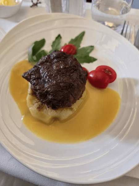 His meal started with the salmon mousse, which was excellent, and came with a slice of garlic bread. The bread was very good but was still plane bread. There was no wine list for either service, so they just offered a choice of red or white.
