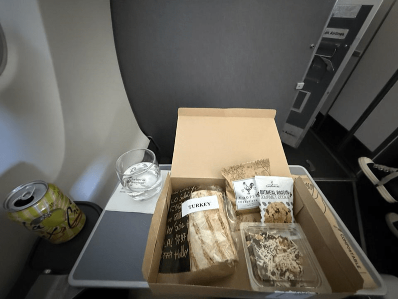 After take-off, our drink orders were taken, and I ordered a sparkling water. The only flavor they had was the La Croix limoncello, so that’s what I had. It was fine. Immediately thereafter, I was given a choice between the turkey or the vegetarian meal box. Both the drink/glass and the meal box were just handed to me.
