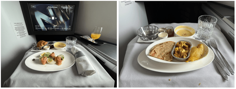 Since this flight normally takes off at 5:35 am (rather than 8:30 am), the first meal was a small breakfast. I selected the smoked salmon starter, which was served with yogurt and a croissant. Then for the main dish, I had the egg masala, which was quite small and not particularly well presented.